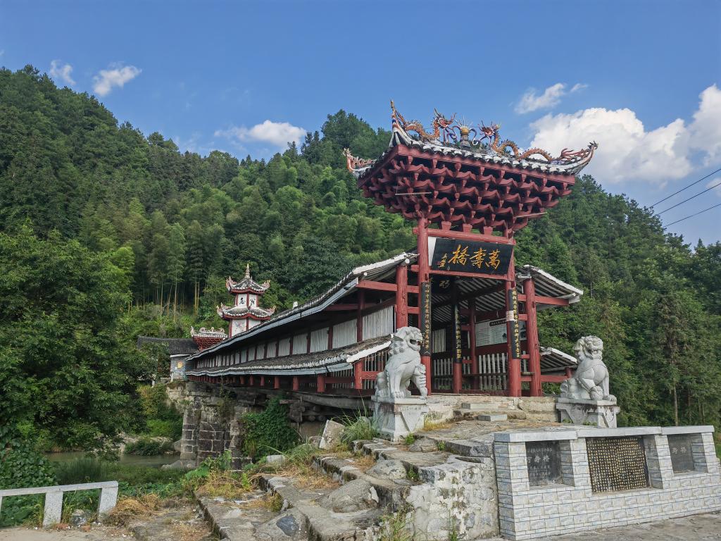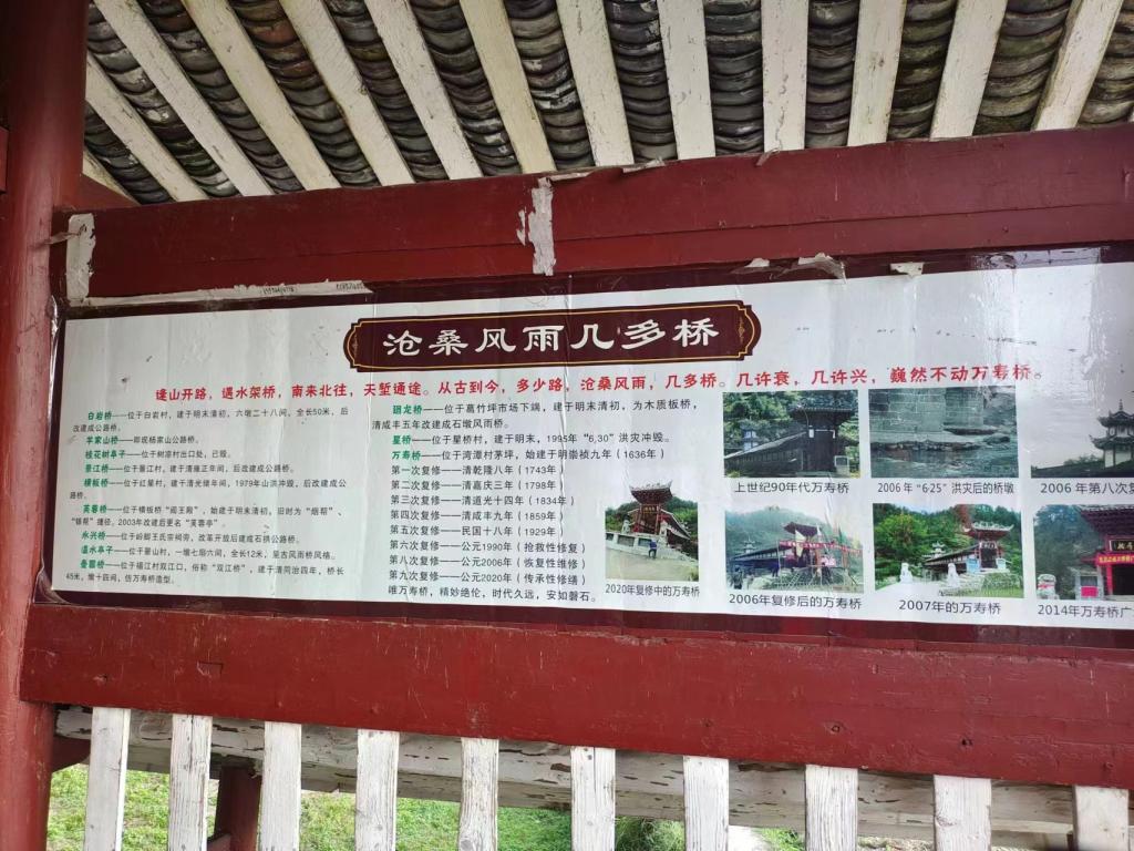 万寿桥是明清时代风雨桥的典型代表,因对研究古桥梁建筑具有学术价值而保存至今。整座桥梁为隼铆结构,横梁之间由隼铆相互连接,整座桥自成一体因而牢不可分。在万寿桥进行了一番走访调查,实践团得知此桥自修建至今,几经磨难,期间经历过大大小小共九次修缮,其中不乏有大水毁灭性的冲垮,如今却依然完整地存立于此,正应了桥上所记的那句“从古到今,多少路,沧桑风雨,几多桥。几许衰,几许兴,巍然不动万寿桥。”