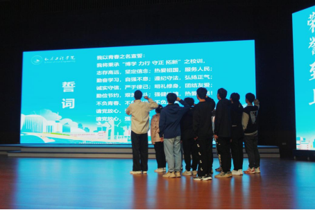校示范班集体班长蒋志鹏从“一红指引”、“两点联动”、“四方领航”方面进行了班级风采展示。学院就业助理王旭光围绕大学生生涯规划进行分享,详细地介绍了往届毕业生的整体去向、找工作的途径、简历制作方法等。随后,在11位入党积极分子的带领下,全体学生进行宣誓。