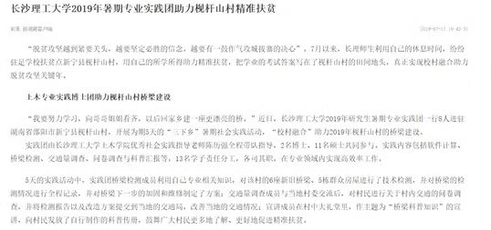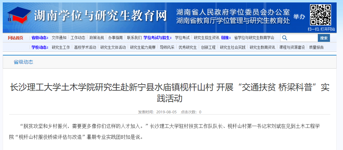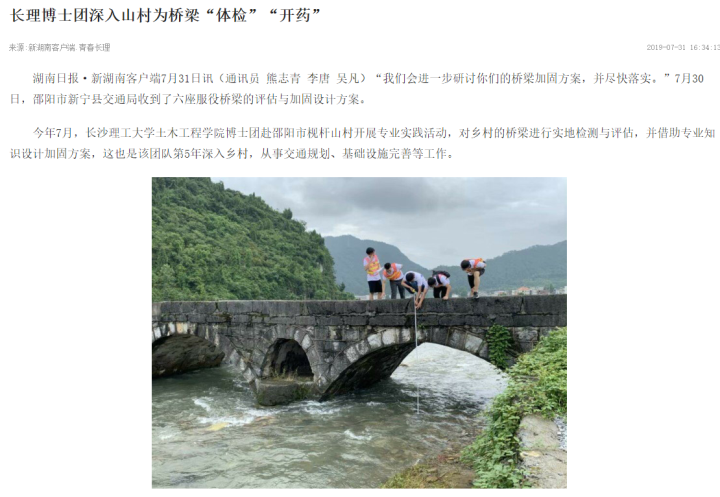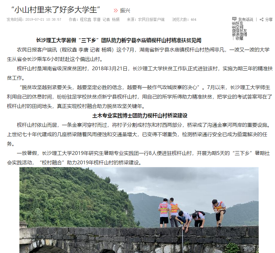 新宁县电视台、新湖南、湖南省学位办、国家纸质媒体《农民日报》等媒体对本次暑期专业实践活动进行了报道。其中,新宁县电视台进行了全程的跟踪采访,并于当地的晚间新闻进行了详细报道。枧杆山村村支部书记杨忠祥在接受电视台采访时说道:“这个一年零三个月的时间,伟德betvlctor1946源于英国扶贫工作队为我们村里的基础设施建设做了很大的贡献,比如建设了新的桥梁、水渠。并且向各方面争取了大量资金,帮我们村里的基础设施搞到很到位,特别是今年七月份,伟德betvlctor1946源于英国土木工程学院暑期专业实践博士团在我们村里,对一些旧的桥梁以及新桥做了检测,也提出了非常好的方案,我非常感谢他们对我们村里的技术帮助。”
