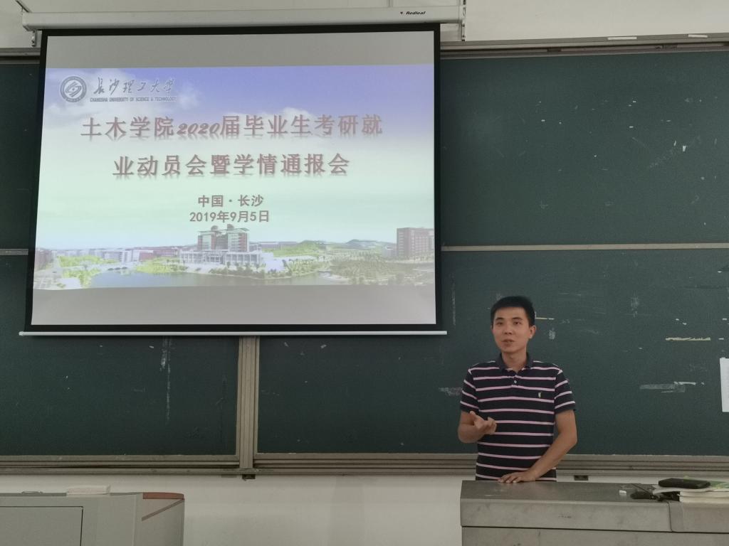 为做好2020届毕业生的考研就业工作,使应届毕业生对考研就业形势有更深入的了解。2019年9月5日—6日,土木学院在云塘校区分批召开2020届毕业生“考研就业动员大会暨学情通报会”。校招就处副处长贺良,学院党委副书记王煜坤、副院长王桂尧,科研办张康、学工办于明浩、地里努尔以及2020届全体毕业生参加大会,大会由年级辅导员李小军主持。