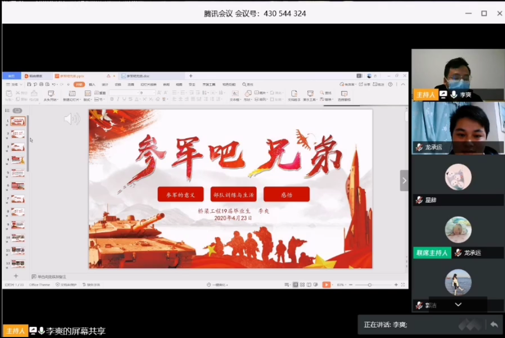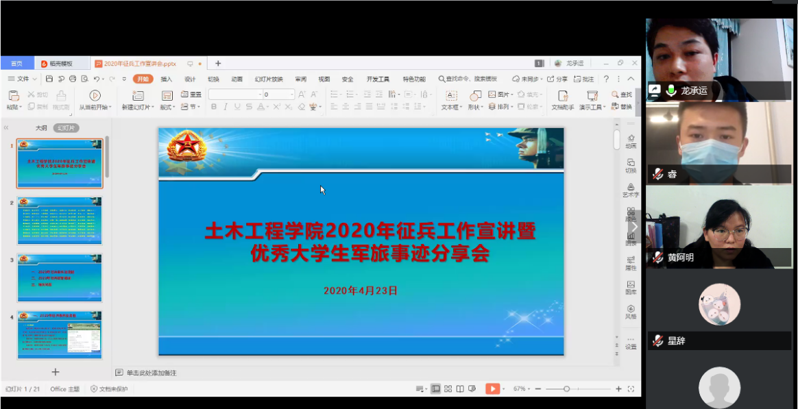 为做好国防教育和征兵宣传工作,进一步增强国防观念,激发广大青年大学生的参军热情。4月23日晚,土木学院线上召开征兵工作宣讲暨优秀大学生军旅事迹分享会。会议由院学工办老师龙承运主持,院党委代理副书记黄阿明,优秀校友刘睿、李爽出席会议。