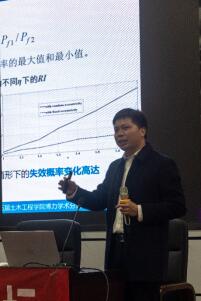 蒋友宝教授以汶川地震桥梁房屋柱体的损伤引入讲座,指出混凝土偏压构件截面偏心距值变异性较大,超出规范较多,所以有一定的研究必要。蒋教授通过偏心柱极限状态方程对比进行双偏压柱可靠度的模型分析,通过一系列对比,一般通过钢筋超配来调整失效概率。随后蒋教授对中美欧规范混凝土柱承载可靠度对比,中美两国规范在承载力计算上形式一致,但中国用设计值,美国则是名义值,系数也存在差异,但中美双方的稳定性系数波动范围都很大,伟德对美国规范进行了优化并将成果发表在了美国土木工程学报上。欧洲规范也大致相同。最后蒋教授介绍了他们团队在柱可靠性上的一些专利情况,为我们开拓了思路,例如在失效部位设置芯柱和可更换部件的钢筋混凝土柱。