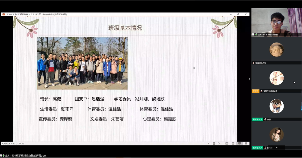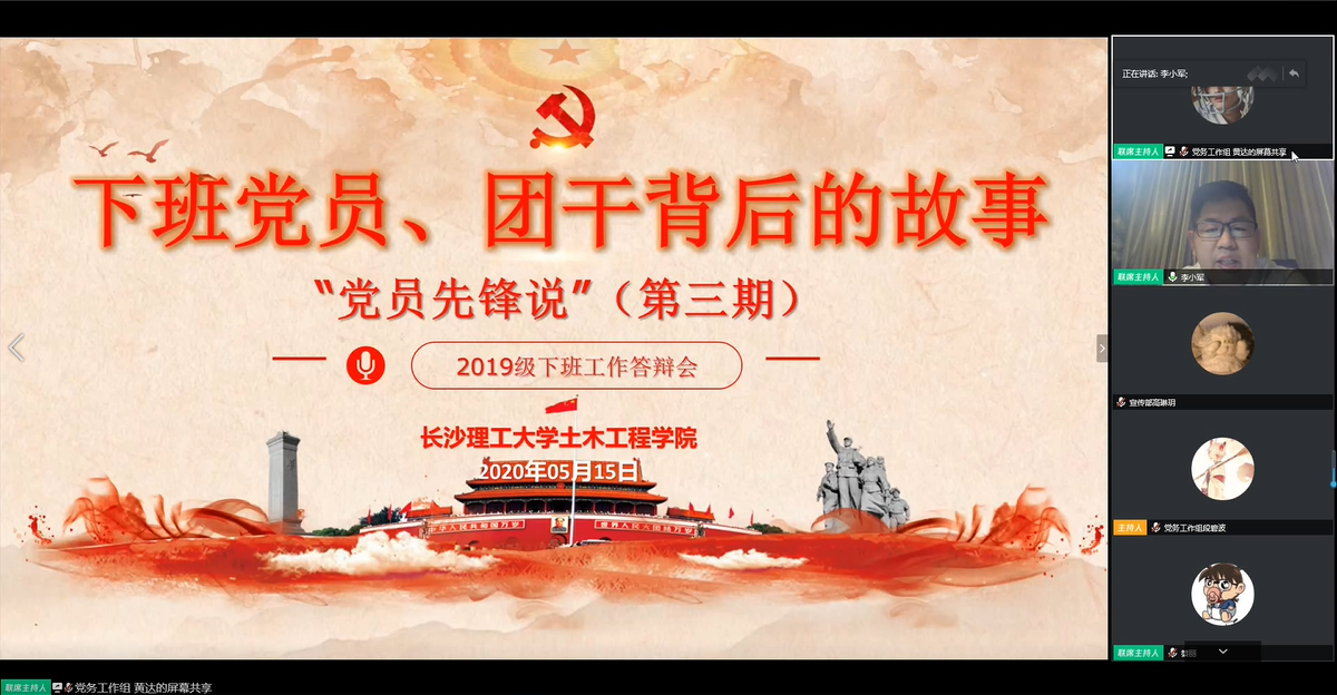 5月15日晚,土木工程学院“党员先锋说”(第三期)暨2020年下班工作答辩会在线上如期举行,院党委副书记黄阿明,院团委书记綦丽,学工办龙承运、董治佑与2019级所有下班党员、下班团干参加答辩会,会议由学生党总支副书记李小军主持。