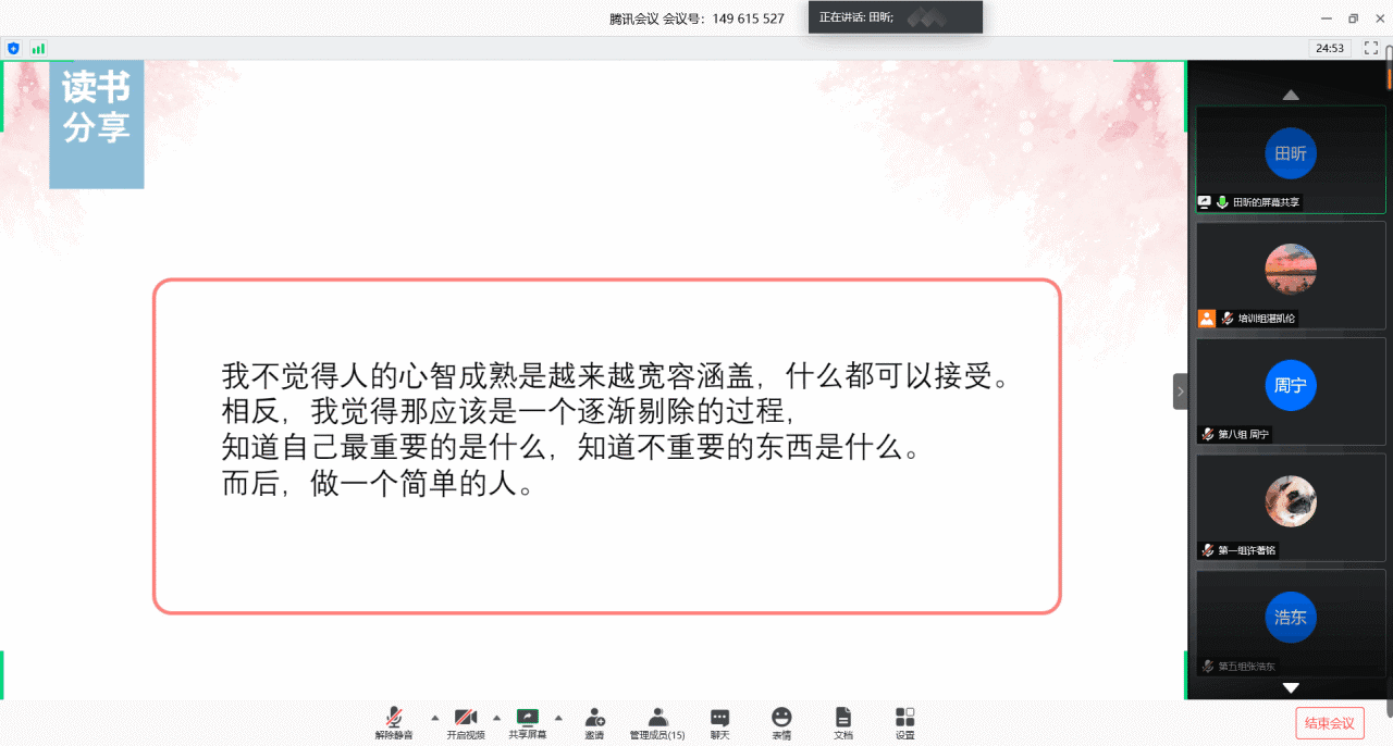 “我很感慨,《平凡的世界》应该算是在我们这一期中分享次数最多的一本书之一了,它生动的诠释了平凡的意义,它让我明白了每个人都会遇到生活的挫折,这是很平凡的,但不同的是,有的人对主人公孙少平的理解是最深的,有的人对孙少安的理解是最深的。这次的分享会让我更加理解了别人的觉醒期,也更理解了平凡的生活,我以为我和别人是不一样的,但其实我们是一样的平凡。其实平凡,对我而言就是最好的状态。”第35期积极分子、土木1905班罗扬帆在读书会后这样感慨道。