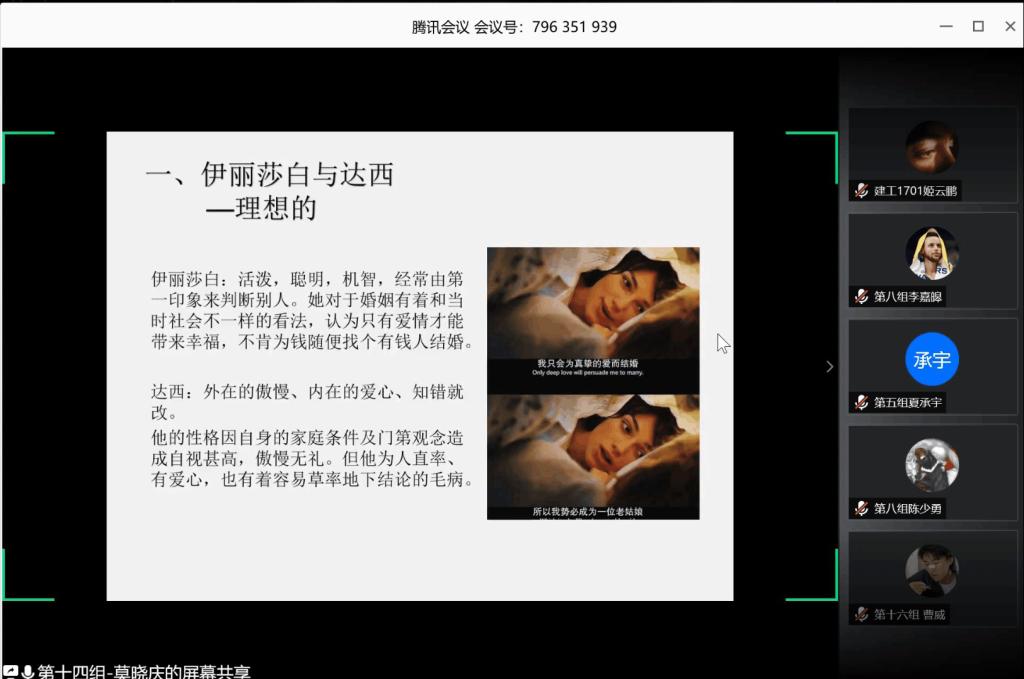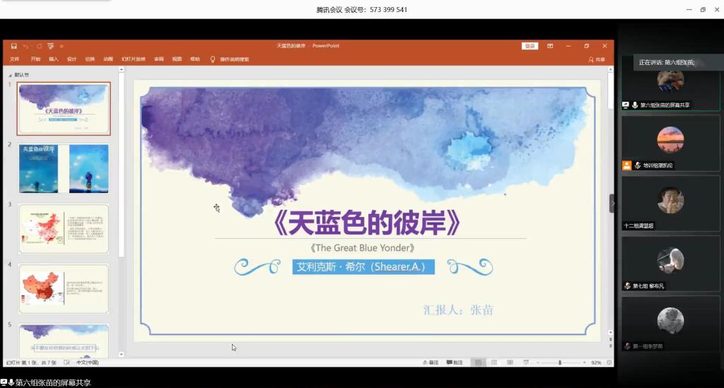 读书会分四个会场同时进行,每个会场有13-14名阅读者分享了自己近期阅读的书籍,采用PPT的方式进行了讲解展示。第21期预备党员、城轨1601班张苗分享了书籍《天蓝色的彼岸》,在2020这个不同寻常的一年,她第一次切身感受到了生命的脆弱。她说:“每一个生命的逝去,都给了我们足够的时间去平静。我们常常无法甄别哪一次暂别会变成永别,只要翻出回忆来看,遗憾总是如影随形。我们要有一个正确的生死观,我们要勇敢的正视死亡,人对生命最正确的态度就是珍惜生,但不畏惧死。”第35期入党积极分子曾佳谈到了在阅读了《读三国学智慧》之后的感受,他说:“做事之前先做人,这是一个人一生必不可缺的品质。一个举止大方得体,品味高雅、语言幽默的人,肯定是一个有修养的人,他也许没有惊人的财富和荣耀的地位,但他的智慧、气质与风度足以让众人敬仰。”