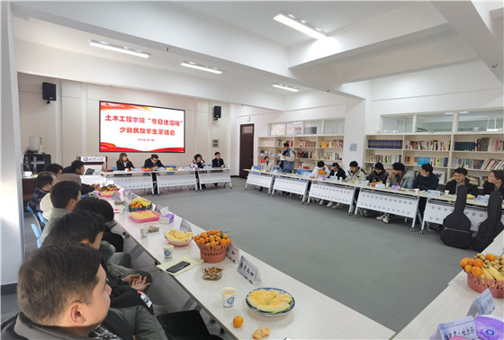 1月12日下午,土木学院在云塘校区工二A304举行了“冬日送暖”少数民族学生茶话会。学院党委书记丁丹、党委副书记(代理)黄阿明,学工部木拉迪、地里努尔老师,学工办全体年级辅导员与学院47名新疆籍、西藏籍少数民族学生亲切畅聊,并送上了冬日的温暖和关心。茶话会由汪伦老师主持。