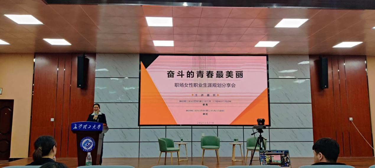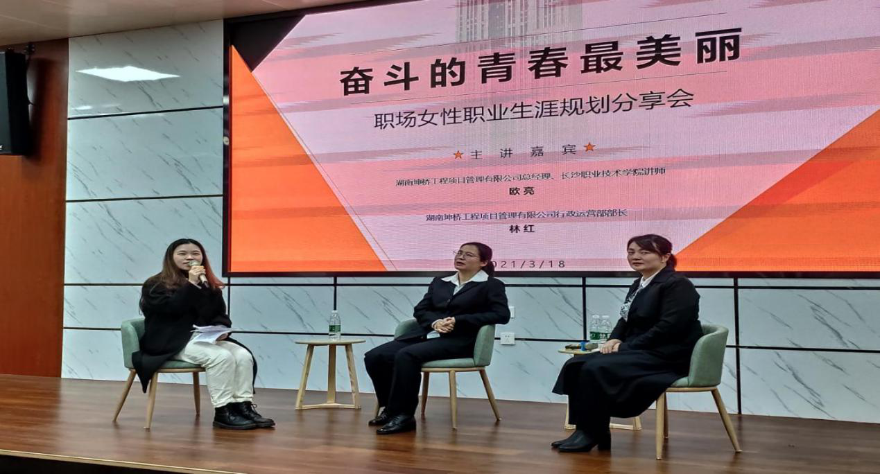 3月18日晚7点,土木工程学院“云影讲坛”——“奋斗的青春最美丽” 职业规划分享会在四教报告厅开展。本次活动邀请到的嘉宾是湖南坤桥工程项目管理有限公司的总经理欧亮和行政运营部部长林红,两位嘉宾从自身成长、创业经历、职业生涯规划以及如何做到家庭与事业兼顾等方面给同学们做分享。活动采取线上+线下的方式进行,由研究生杨莹主持,共计约300名研究生参与。
