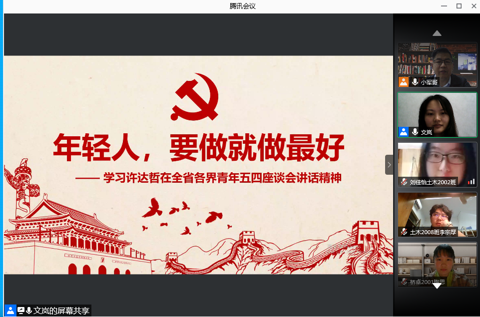 4月29日,土木工程学院通过腾讯会议平台召开线上会议,以“年级人,要做就做最好”为主题,组织学习许达哲在全省各界青年五四座谈会讲话精神。2020级辅导员文岚,2020级年级分会全体干部、全体班委和入党积极分子参加学习。辅导员李小军主持会议。