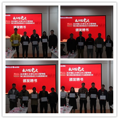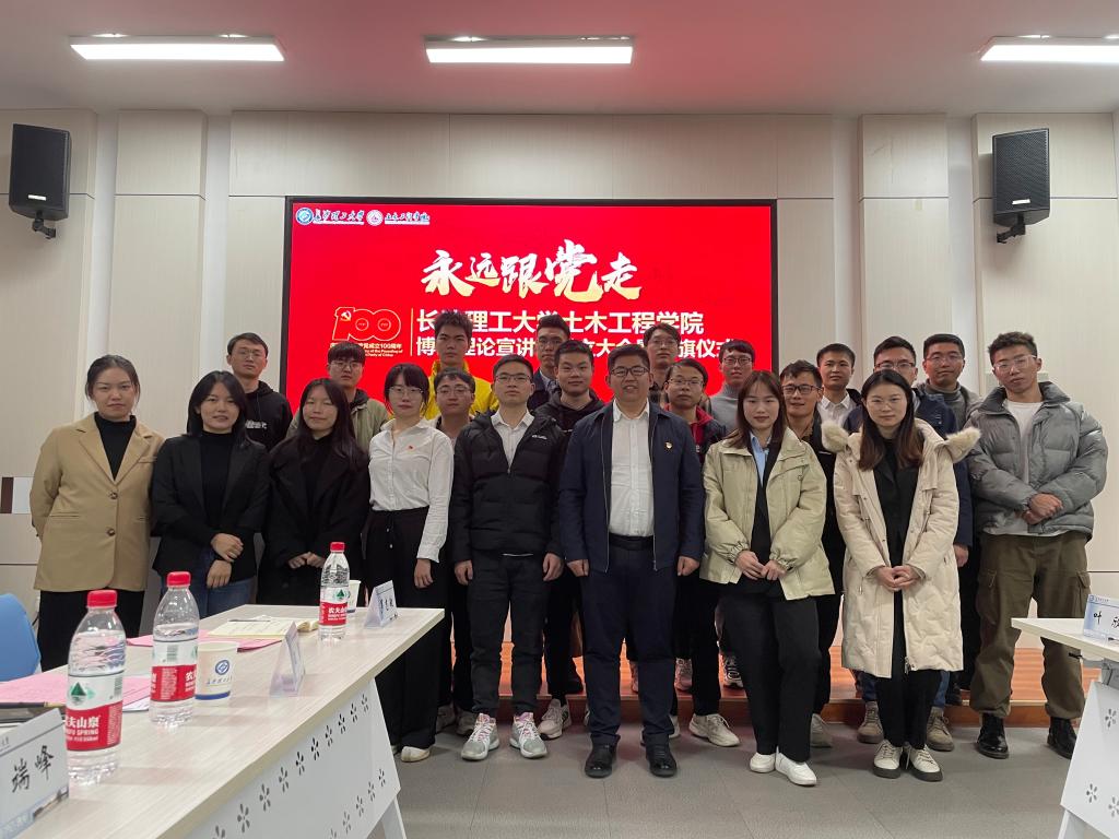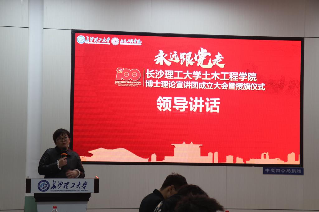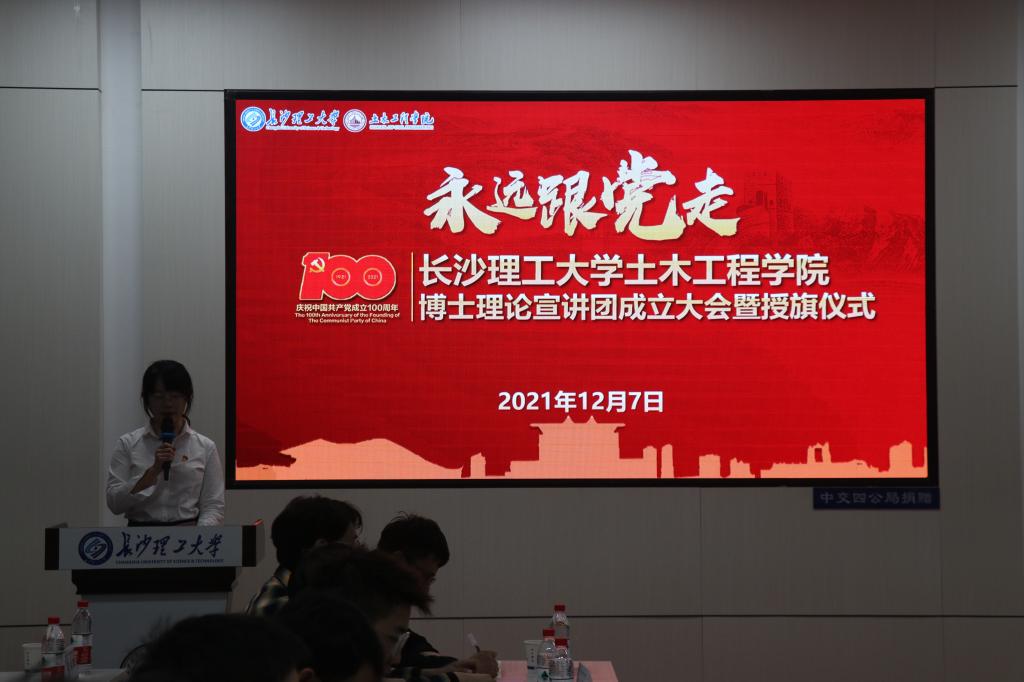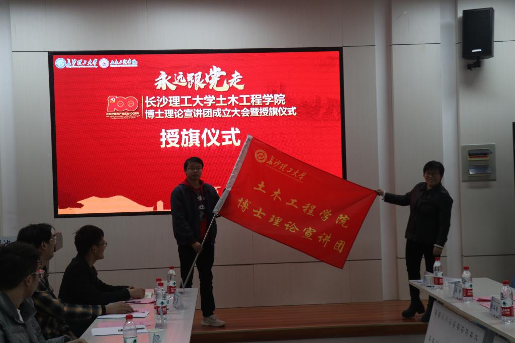为深入学习贯彻习近平新时代中国特色社会主义思想,做好党的十九届六中全会精神宣讲工作,12月8日,土木工程学院首届博士理论宣讲团成立大会暨授旗仪式在学院学生发展中心举行。院党委副书记黄阿明,湖南智创未来教育科技有限公司董事长、教育部全国万人优秀创新创业导师成忠,院学生工作办公室主任李小军及全体博士理论宣讲团成员出席参加成立仪式。2020级博士研究生叶欣主持会议。