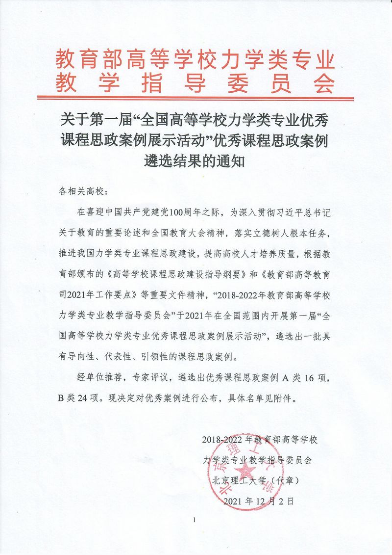 此次课程思政案例展示活动开展在喜迎中国共产党成立100周年之际,为深入贯彻习近平总书记关于教育的重要论述和全国教育大会精神,落实立德树人根本任务,推进我国力学类专业课程思政建设,提高高校人才培养质量,根据教育部颁布的《高等学校课程思政建设指导纲要》和《教育部高等教育司2021年工作要点》等重要文件精神,“2018-2022年教育部高等学校力学类专业教学指导委员会”在全国范围内开展“全国高等学校力学类专业优秀课程思政案例展示活动”,遴选出一批具有导向性、代表性、引领性的课程思政案例。