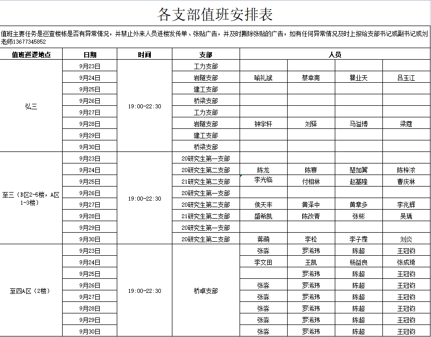 9月19日下午,我院组织全体党员干部召开会议,就国庆放假、安全隐患排查等事宜进行了强调。为实时掌握各学生宿舍、教学楼栋异常情况,各支部安排了巡逻值班,巡查时若有异常情况及时上报,禁止外来人员进楼发传单、张贴广告,及时撕除张贴的广告,形成了班级干部-年级干部-学院干部,日常事务管理干部-团学干部-党员干部信息员体系。