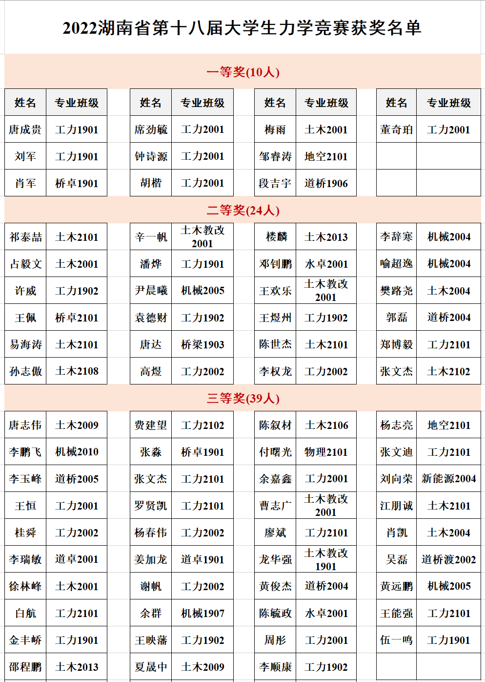 近日,湖南省第十八届大学生力学竞赛获奖名单公布,伟德喜获一等奖10项、二等奖24项、三等奖39项,共计73项省级奖,获奖比例和获奖人数均创历届新高。湖南省大学生力学竞赛旨在培养人才、服务教学、促进高等学校力学基础课程的改革与建设,增进学生学习力学的兴趣,培养学生分析、解决实际问题的能力。本次竞赛由省教育厅主办,中南林业科技大学承办,共有来自中南大学、湖南大学、国防科技大学等高校的1258名学生参赛,比赛共设置一等奖63名,二等奖127名,三等奖241名。