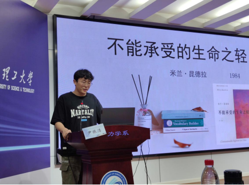 工力1901班学生尹振浩以“探索生命与爱的终极”为主题,对《不能承受的生命之轻》一书作了深入解读。他从本书的写作背景入手,一步步向大家剖析四位主角的感情纠葛,展现了存在主义哲学与男女情爱完美融合的文学。他说:“轻是轻盈,缥缈;重是重量,责任。生命中有太多事,看似轻如鸿毛,却让人难以承受。”轻与重的选择与平衡,引发了大家对人生的命运与价值的思考。