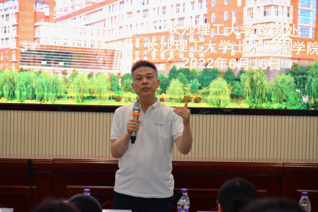 为推进BIM技术应用的学习和发展,由校教务处主办、土木工程学院承办的第三届“航天杯”BIM技术大赛决赛暨颁奖仪式,于6月16日下午在工二B302举行。湖南航天建筑工程有限公司党委委员、副总经理、纪委书记苏晏,总工程师易建辉,总经理助理、人力资源部部长张月月,技术质量部部长王新槐,BIM中心主任刘子翔,人力资源部专员陈江鹭,教务处副处长吴钢,土木工程学院党委书记江河,副书记黄阿明,副院长付果以及湖南航建相关负责人与学校相关指导老师出席本次活动。本次比赛由院团委学生会科技部干事李江悦主持。