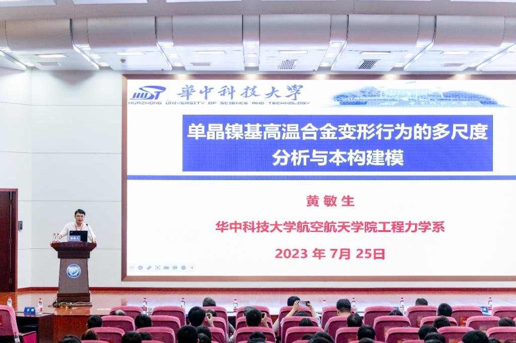 华中科技大学黄敏生教授针对航空发动机叶片在极端高温服役环境中的关键力学问题,作了题为“单晶镍基高温合金变形行为的多尺度分析与本构建模”的报告,介绍了离散位错动力学先进算法框架以及单晶镍基高温合金变形的位错演化机理和晶体塑性本构。