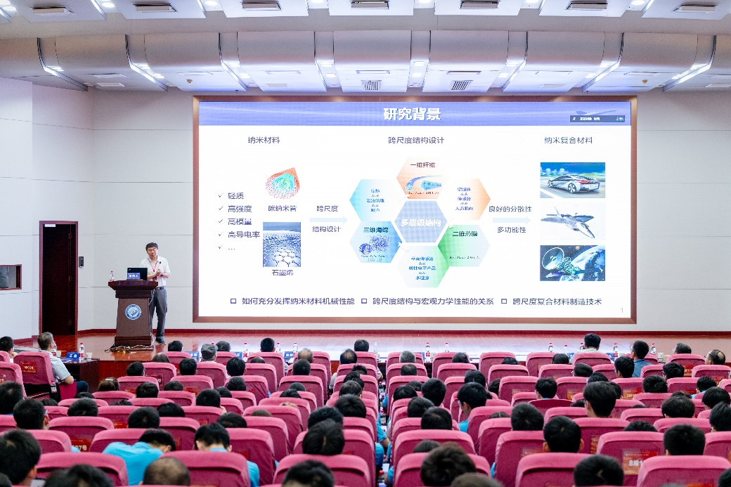 哈尔滨工业大学赫晓东教授聚焦于航空和水下新型武器设备中材料的力学性能要求高的问题,作了题为“先进跨尺度复合材料的结构设计、力学及制造”的报告,介绍了碳纳米管基和石墨烯基跨尺度增强体及其复合材料的力学特性,并通过设计不同结构解决了流-固-声多场耦合等力学设计难题。