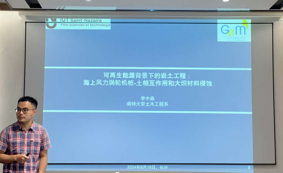 活动中李中森助理教授简要介绍了法国南特大学岩土实验室的科研情况和师资力量;分享了科研工作中遇到的困难以及解决方法;介绍了海上风力涡轮机基础横向响应及大坝材料侵蚀方面的最新研究进展;阐述了海上风力涡轮机桩-土相互作用机理以及选择合理的本构模型的重要性。随后,李中森助理教授与“边坡防灾减灾团队”各位老师就“如何实现交通与新能源间相互融合”等问题进行了讨论,大家一致认为开展交能融合方面的研究具有必要性和紧迫性。