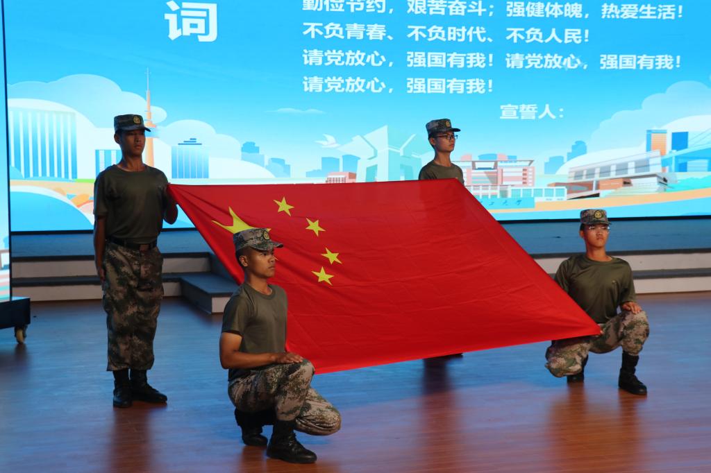 典礼最后,国旗在民兵连的护送下庄严入场,全体新生在教官、下班党员、下班干部代表的带领下进行国旗下宣誓,他们承诺要始终秉承“博学 力行 守正 拓新”之校训,以青春之我,担青春之责,为实现中华民族伟大复兴的中国梦贡献青春力量。在悠长的校歌声中,此次2024级新生开学典礼圆满结束。