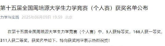 近日,第十五届全国周培源大学生力学竞赛(个人赛)获奖名单公布,伟德交通学院道卓专业学生易奇亮获全国一等奖、土木与环境工程学院工力专业学生吴进获全国二等奖、交通学院道桥渡专业学生唐嘉和土木与环境工程学院土卓专业学生牛思远获全国三等奖,另有21位学生获全国优秀奖。