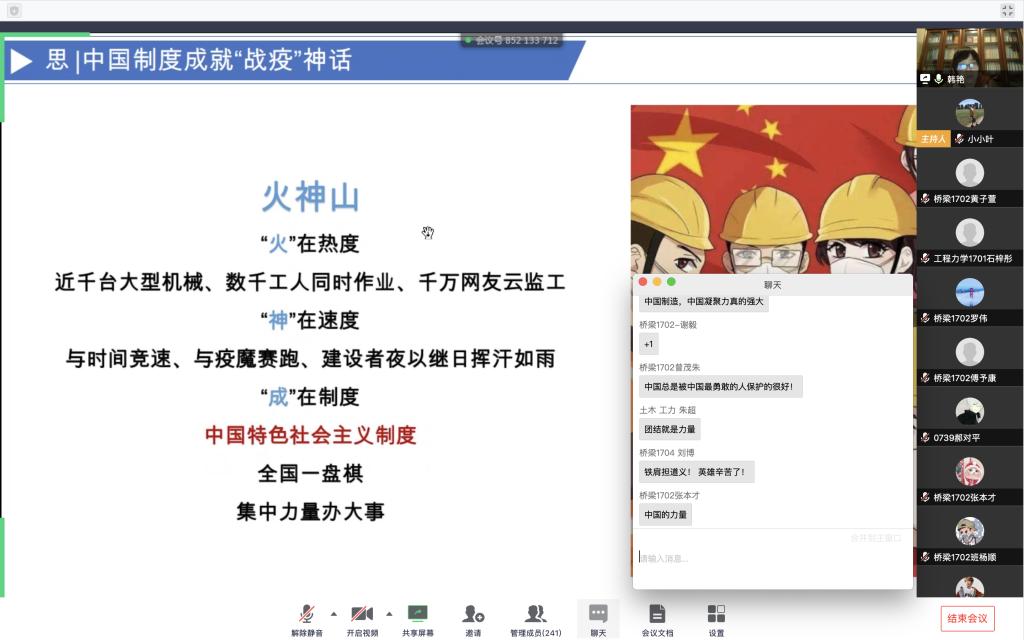 老师们的讲课在学生中引发强烈共鸣,聊天框和自由互动反响热烈。桥梁1704班林栋平时安静内敛,在课堂互动环节他却主动为自己争取到发言的机会:“我爸爸是当地卫生计生综合监督执法局的一名普通党员……他已经连续奋战40多天,我很担心他,更为他骄傲。关键时刻冲得上去,危难关头豁得出来,我想这就是共产党人的党性。我们正是因为千千万万他们这样的人才被保护得很好……我也希望自己向爸爸学习,成为一名敢担当勇冲锋的共产党员。”同班同学曹宇佳打开视频发言时,眼眶中闪烁着泪水,他动情地说:“如果奇迹有颜色,我想那一定是中国红!