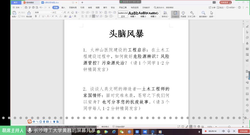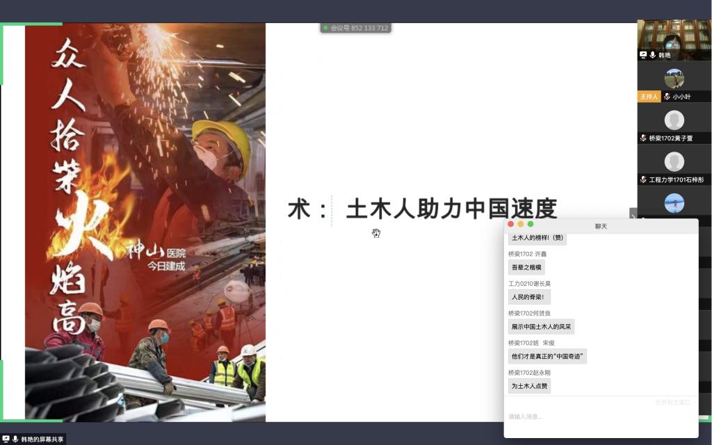 聊天框里热评如潮,主讲老师引人入胜的讲授引发了土木学子的专业自豪。“哪有什么基建狂魔,不过是一群善良朴实的建设者披上铠甲挺身逆行。在抗击疫情的战场上,各行各业用行动践行着自己的职业信条。医生救死扶伤,军人保家卫国,土木人逢山开路,遇水架桥!专业强国,实干兴邦。无论是在岁月静好中,还是在国家危难时,土木人都大有可为,大有作为!”在研究生课程思政分会场,主持人胡蓉勉励土木研究生以扎实的专业知识和务实的土木精神投身中国梦的伟大实践,将青春热血奉献在祖国最需要的地方。