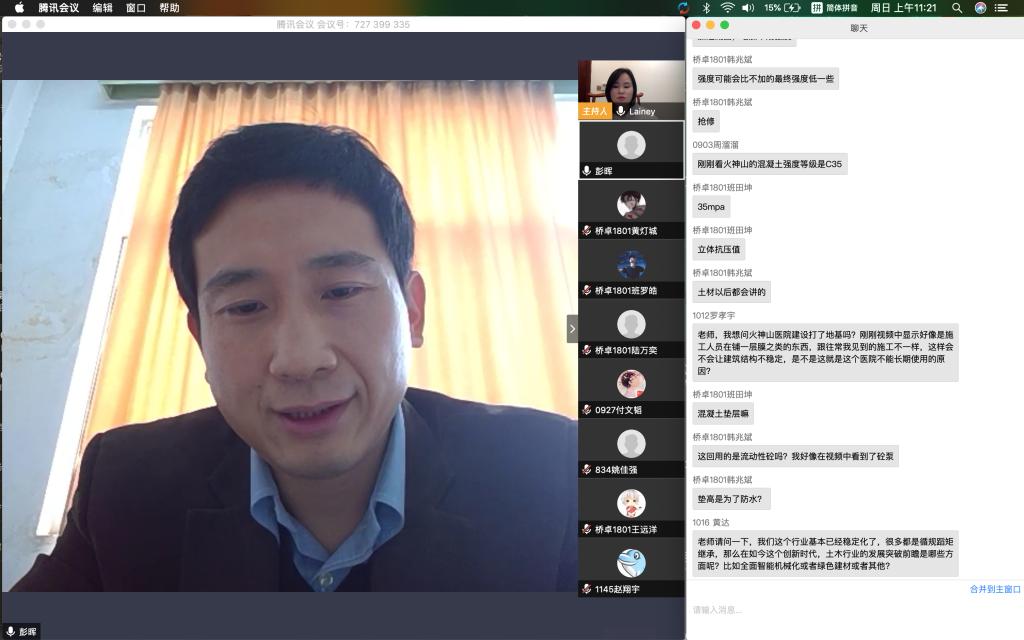“老师,刚刚您说到地基基础时,需要在混凝土浇筑时加入速凝剂,请问跟没加相比大概是什么样一个效果呢?”在2018级的课程思政分会场,同学们的专业学习热情被充分激发,问题层出不穷。“同学们听得相当仔细。的确,混凝土正常达到设计强度大约需要28天,如掺入速凝剂,可加速混凝土的硬化和强度发展,在很短的时间内产生足够的强度。速凝剂保证了火神山医院快速施工的要求。”“南方地区桥梁长期性能提升技术”国家地方联合工程实验室副主任彭晖教授耐心的回答着同学们的疑问。在2017级分会场,鲁乃唯博士结合视频详细介绍和对比了活动板房与厢式板房这两种火神山医院主要采用的快速拼装结构的性能特点和组装技术。