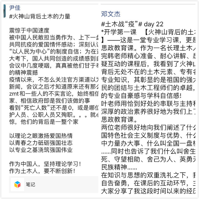 “震撼、感动、自豪、骄傲、超燃”成了这一课堂反馈的高频词汇,很多学生家长都成为这堂课的旁听生。“我太喜欢这堂课了!作为中国人,坚持理论学习!”“我看到了火神山速度背后无处不在的土木元素、专有名词、专业知识,其彰显的是祖国的强大、人民的团结与土木工程师们的卓越,满满的专业自豪感与学科自信感!”不少同学课后在朋友圈记录下自己的心情。肖勇刚教授2月28日为毕业生开讲第一课后,岩土1602班阳吉首就留言感慨:说的我热血沸腾,只想去工作了。