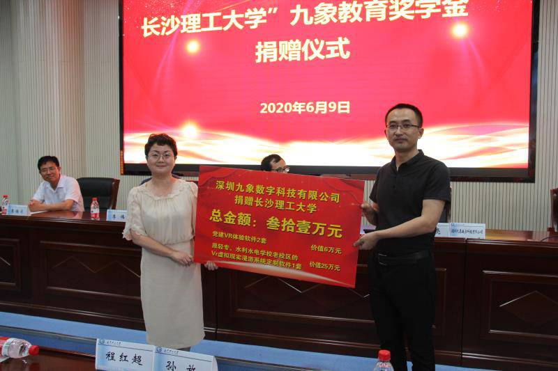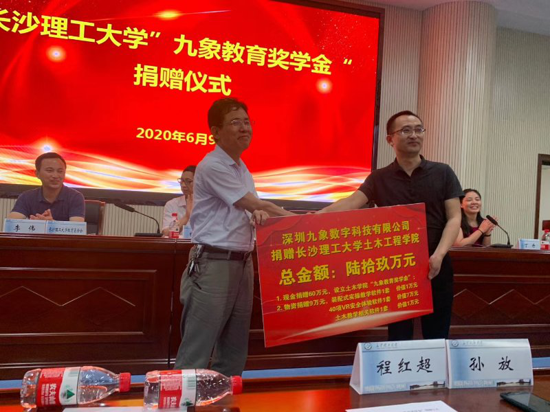 深圳市九象数字科技公司在董事长周亮带领下为母校共捐赠价值100万的现金和设备,包括捐赠给伟德betvlctor1946源于英国党建VR体验软件两套、原轻专、水利水电学校老校区的VR虚拟现实漫游定制软件1套和捐赠给土木工程学院九象教育奖学金60万、配套式实操教学软件一套、40项VR安全体验软件1套、土木教学相关软件1套。周亮以“感恩母校,筑梦远航”为题做了分享,他表示捐赠“九象教育奖学金”是心怀感恩,希望能够帮助母校培育更多的人才,为国家、社会、母校的发展尽自己绵薄之力。他结合九象公司的企业文化、“智慧工地”项目板块为全体老师展示了九象公司内核与发展愿景,期待进一步推进校企合作。