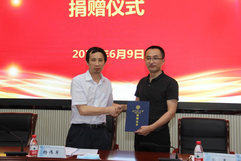杨伟军代表学校为周亮颁发捐赠证书,并在讲话中高度赞扬了周亮等校友的伟大情怀,他指出,设立“九象教育奖学金”具有重大意义,此举彰显了校友的感恩之心,更为加强学校与企业、社会之间的联系注入强大活力。