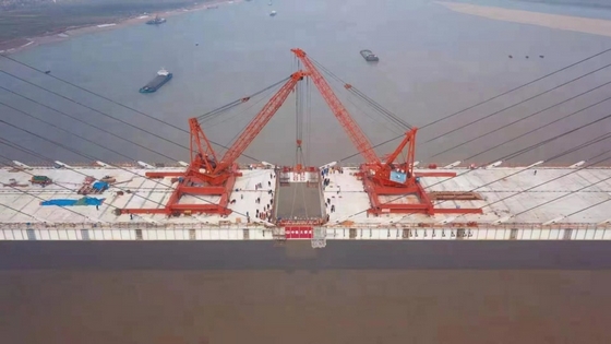赤壁长江大桥为主跨720米的双塔双索面结合梁斜拉桥,主梁采用混凝土板和钢主梁上下结合的布置。结合梁斜拉桥受力复杂,设计与施工难度较大,此前世界上已建成的该类型斜拉桥的主跨不超过660米,而赤壁长江大桥一举突破了700米的大关!