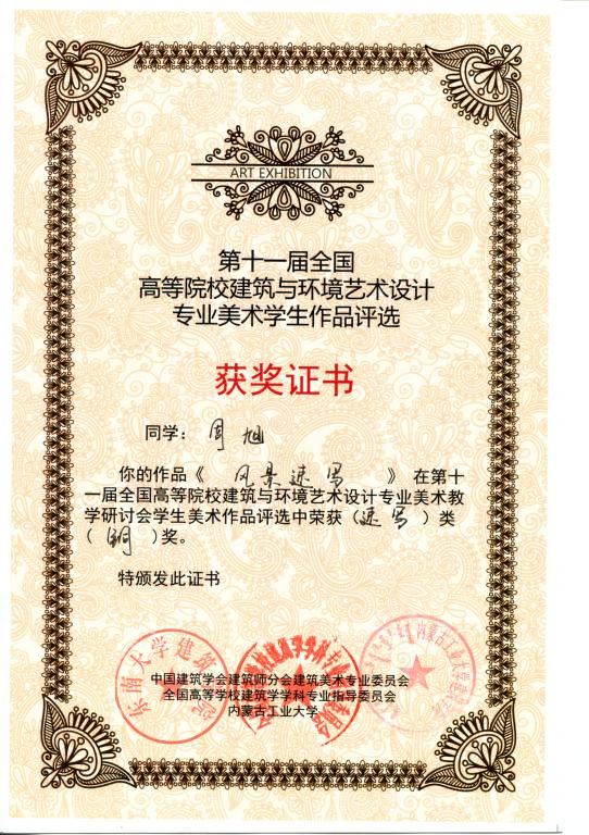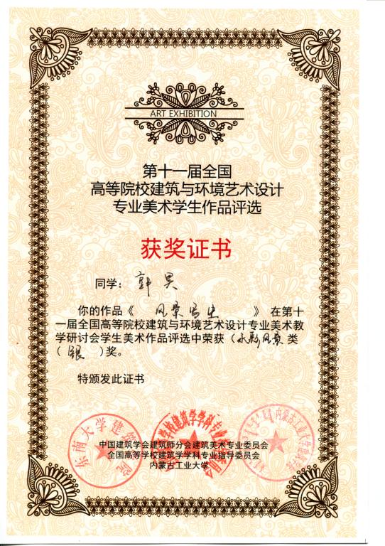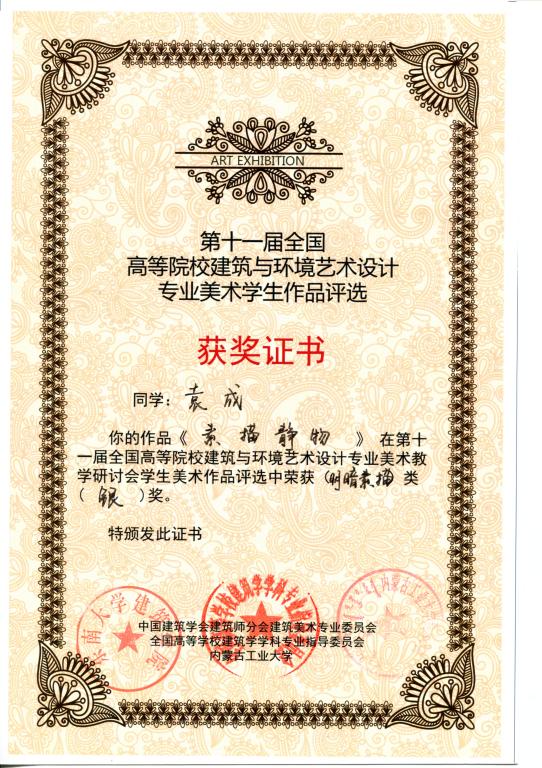 2011年9月22—26日,在内蒙古工业大学召开的第十一届全国高等院校建筑与环境艺术设计专业美术教学研讨会上传来喜讯,伟德郭昊、袁成、周旭三位同学的作品分获风景写生类银奖、素描静物类银奖和风景速写类铜奖。指导老师李洁、殷俊、周志高、池春雷。这是由全国高等学校建筑学科专业指导委员会、中国建筑学会建筑师分会建筑美术专业委员会以及内蒙古工业大学联合组织和承办的第一次全国高等院校学生建筑美术作品评奖,在100多个院校入选的400多幅作品中由专家评定产生。另,伟德学生郭昊、袁成、周旭、罗璇、唐荞菀、樊改霞、段红琪、王丛等八位同学的作品入选编入由中国建筑工业出版社出版的《学生作品集》,对这些同学表示祝贺!
