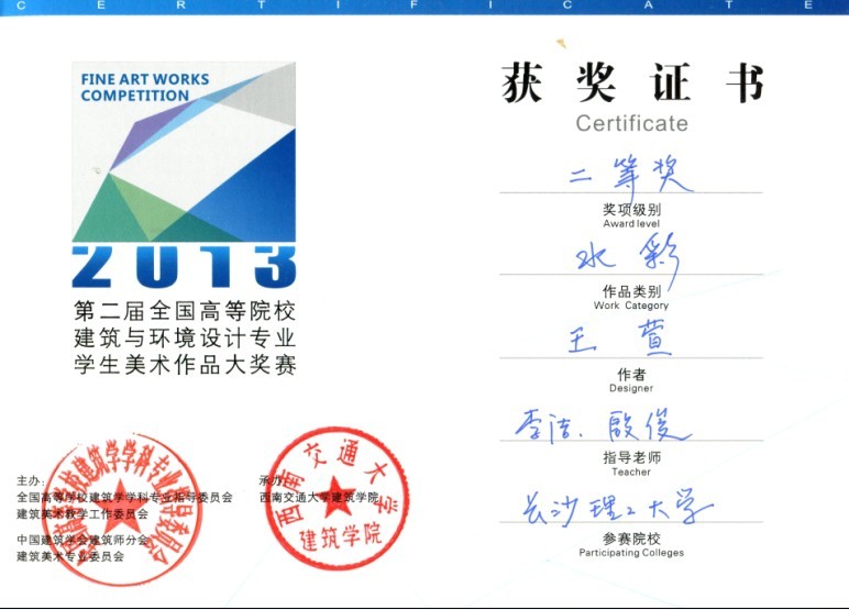 2013年5月17—19日,在西南交通大学召开的第十二届全国高等院校建筑与环境艺术设计专业美术教学研讨会上又传来喜讯,伟德土建学院城市规划系学生王萱同学的作品喜获水彩类银奖。这是由全国高等学校建筑学科专业指导委员会、中国建筑学会建筑师分会建筑美术专业委员会以及西南交通大学联合组织和承办的第二届全国高等院校建筑美术作品比赛,规模比第一次更大,覆盖面更广,水彩类银奖作品全国只有6件。另,伟德学生官志、蒋高达、吴思文、姚乐、周旭、徐航、邢睿、付蓝彤、罗璇、曹若冷、高雨时、史华熙、徐俊虎、罗琪、王彪、严阳等同学的作品入选编入由中国建筑工业出版社出版的《学生作品集》,对这些同学表示祝贺!