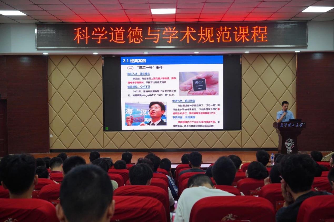 马亚飞以生动的案例开场,讲述了近年来发生的学术造假事件,并引导学生思考学术不端行为对个人、科研团队以及整个学术界的严重影响。他指出,科研诚信是科研工作者不可逾越的底线,任何篡改数据、抄袭、剽窃等行为都会对学术环境造成不可估量的破坏。讲座过程中,马教授还详细解读了国家关于科研诚信的政策要求,并结合学院的具体情况,强调了学院对学位论文的严格审查机制。