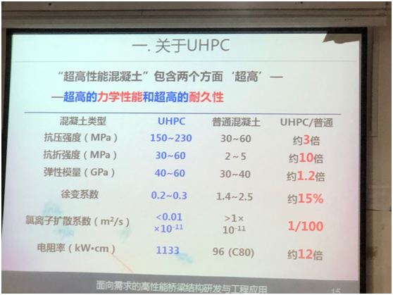 三是给师生们介绍了目前发展的热门—超高性能混凝土(UHPC)的发展。分四个模块,分别是(一)关于UHPC,(二)UHPC用于桥面铺装性能分析,(三)在钢混组合结构中的应用,(四)在旧桥加固中的研究。