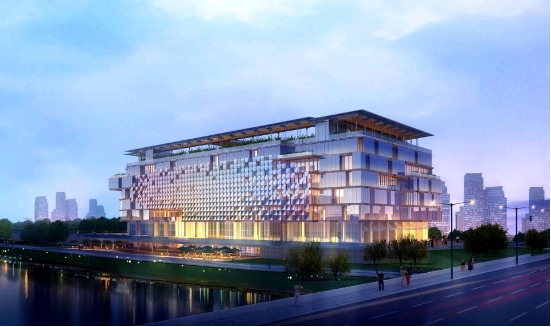 现方案对其进行了优化(主要在成本控制方面),将过于形式主义的膜结构换成了展示墙。