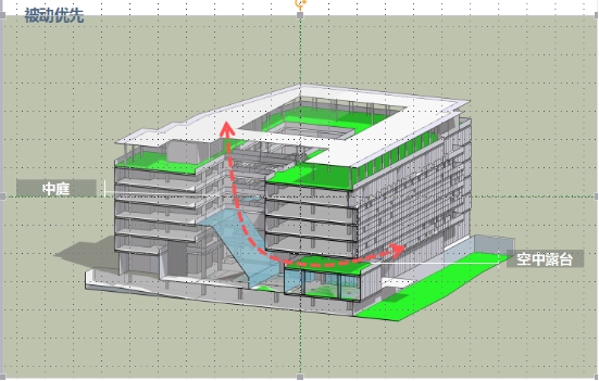 四周布置绿色边庭步行系统,阶梯层层而上,阶梯旁边还分布有阶梯平台