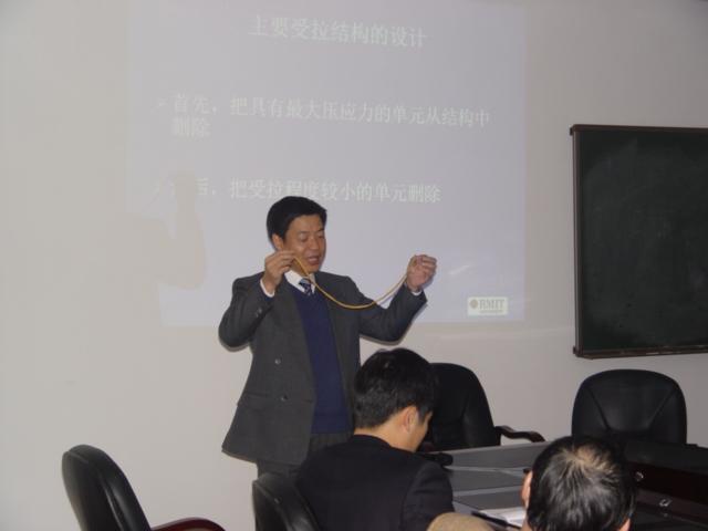 会上,谢亿民教授阐述了渐进结构优化法的基本原理,形象生动的列举了世界上许多著名建筑物的框架结构,深入浅出的介绍了该方法的广泛工程应用,同时还简单的介绍了他所领导的团队研发的结构软件等成果。最后,谢教授还详细回答了老师和同学们提出的各种问题,其平易近人、治学严谨的态度感动了与会的听众。