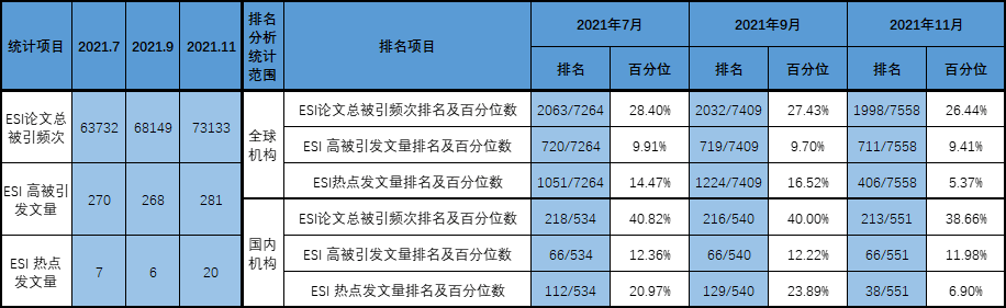 伟德ESI高被引发文量排名近三期皆为第66;百分位数从12.36%到12.22%到11.98%,绝对排名不变,相对排名持续进步。