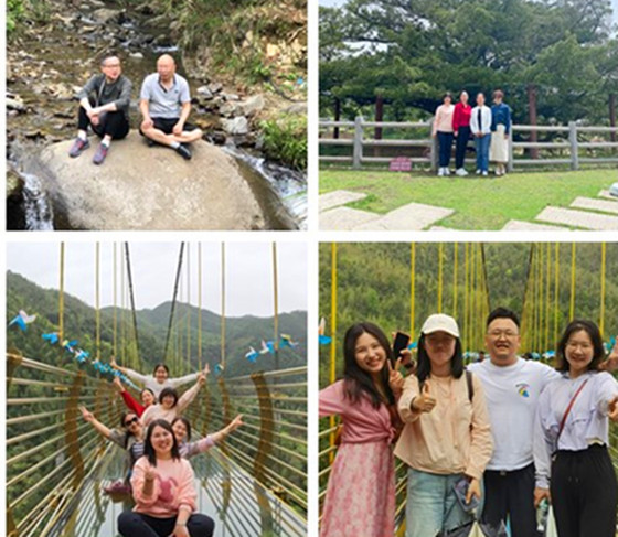 下午,教职工们到达位于浏阳市张坊镇田溪村的西溪磐石大峡谷风景区。这里最受欢迎的是黄金玻璃桥和玻璃滑道。大家沿着峡谷崎岖陡峭的栈道拾级而上,走上了黄金玻璃桥。在惊险的玻璃桥上,他们紧张并开心着,纷纷拿出手机拍照,留下这美丽的瞬间。在刺激的玻璃滑道上,他们犹如在林中走,画中游,笑声不断。