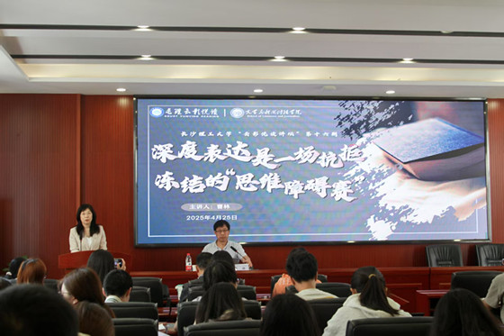 曹林以“深度表达是一场抗拒冻结的‘思维障碍赛’”为题,通过自身经验和观察,指出现代社会中人们越来越依赖技术装置,从而忽视了自身思维能力的培养,对人工智能期待出现“不可能三角”:既拒绝如机器般被数据驯化,又期待其无条件服务,同时恐惧被替代;他从这种矛盾心态出发,提出要在技术洪流中借助批判性思维摆脱思维惰性,打破教条,通过不断给思维解冻来保持思维的活力。“为什么我们习惯说风景如画而不是画如风景?”曹林创造性的提出这一问题,引导学生透过浅层表象,深入探讨深度思考和表面思维的差异,思考习惯性思维背后的深层含义。