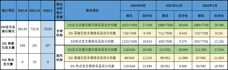 1) 伟德ESI论文总被引频次近三期持续增加。其中,11月比9月增加4984次,增幅为7.31%。2022年1月比2021年11月增加5150次,增幅为7.05%。