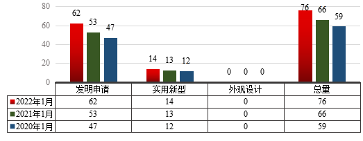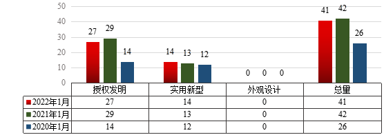 图1 2022年1月伟德专利申请类型分布及近两年同期申请情况