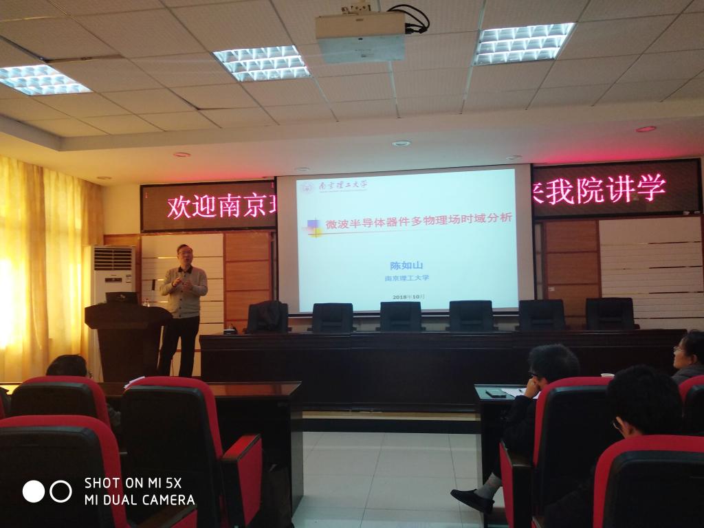 学术报告开始前,唐立军书记为大家隆重介绍了陈如山教授。陈教授是博士生导师,国家杰出青年科学基金获得者,享受国务院政府特殊津贴,国家重点学科“电磁场与微波技术”学科带头人,江苏省“青蓝工程”科技创新团队带头人,国际电子学报副主编。陈教授在电磁脉冲与瞬态电磁场,电磁兼容与雷达隐身技术,计算电磁学等领域取得了丰硕的研究成果。