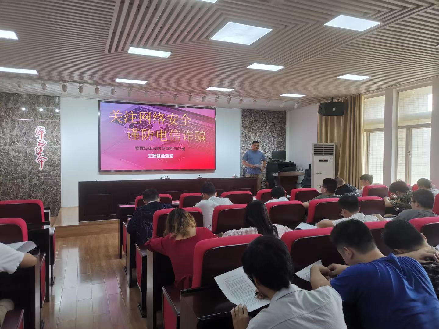 2021年5月6日下午2点半,物电学院在理科楼B413召开2017级防诈骗安全教育大会,大会由2017级辅导员赵俊程老师主讲,2017级全体本科生出席了大会。