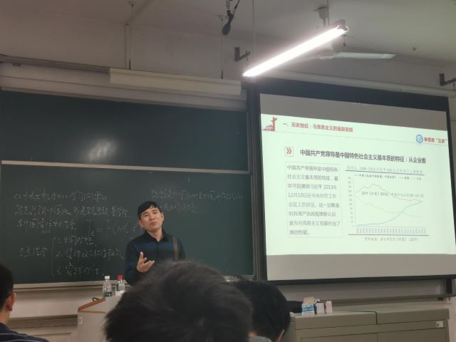 4月23日晚19:00,由物电学院、文新院及法学院党支部共同举办,黄前程老师主讲的“习近平新时代中国特色社会主义思想理论”课程在文科楼B303展开。