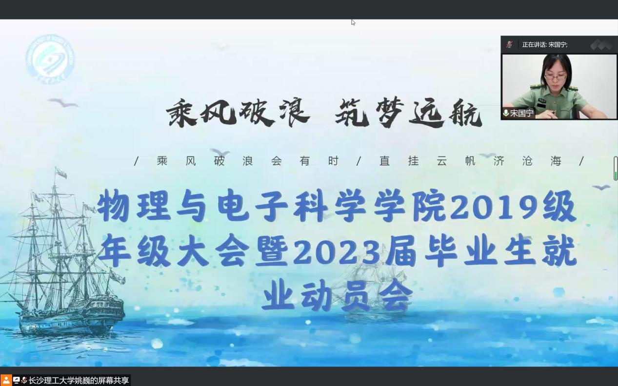 2022年9月2日晚上19点,物电学院线上举办了物理与电子科学学院2019级年级大会暨2023届毕业生就业动员大会。院党委副书记宋国宁出席本次会议,2022届全体学生参加会议。会议由姚巍老师主持。