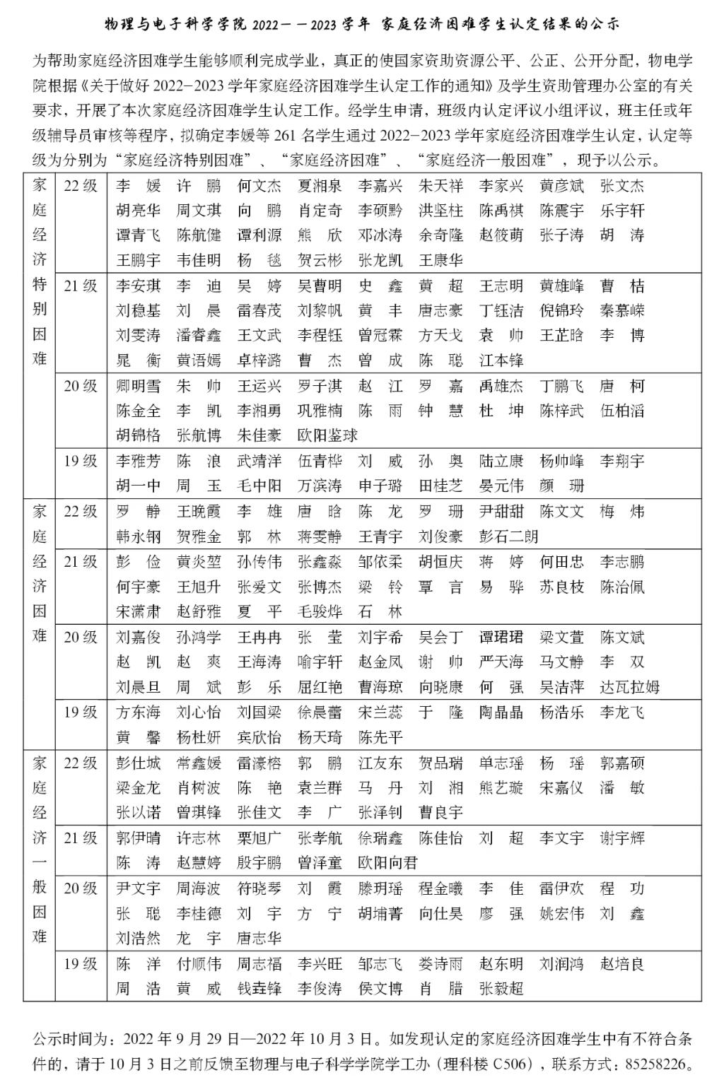 物理与电子科学学院2022——2023学年 家庭经济困难学生认定结果的公示