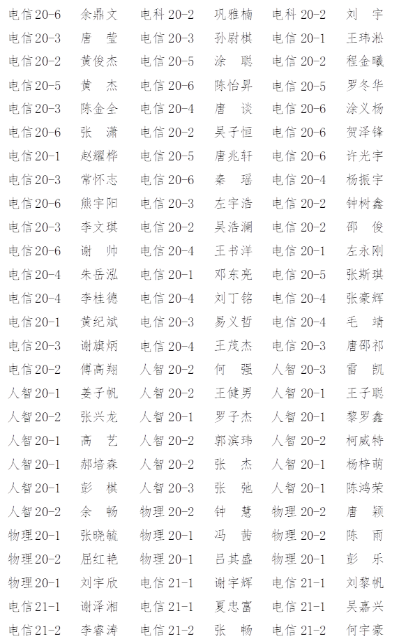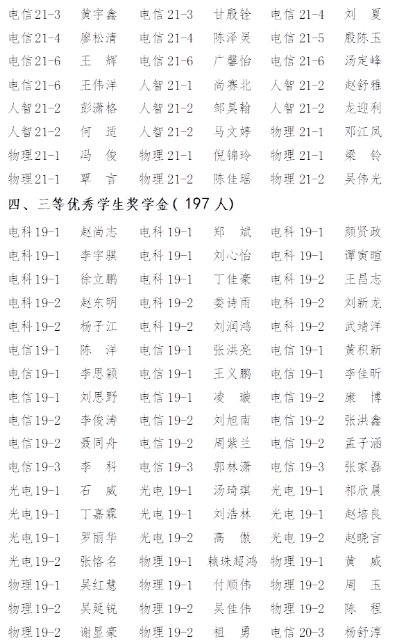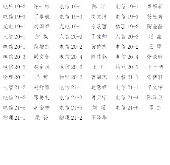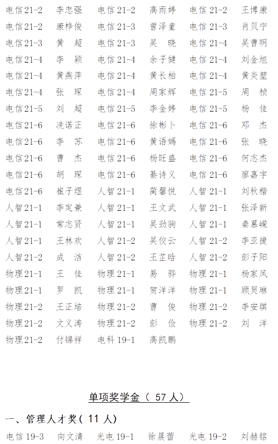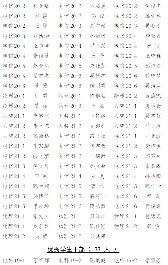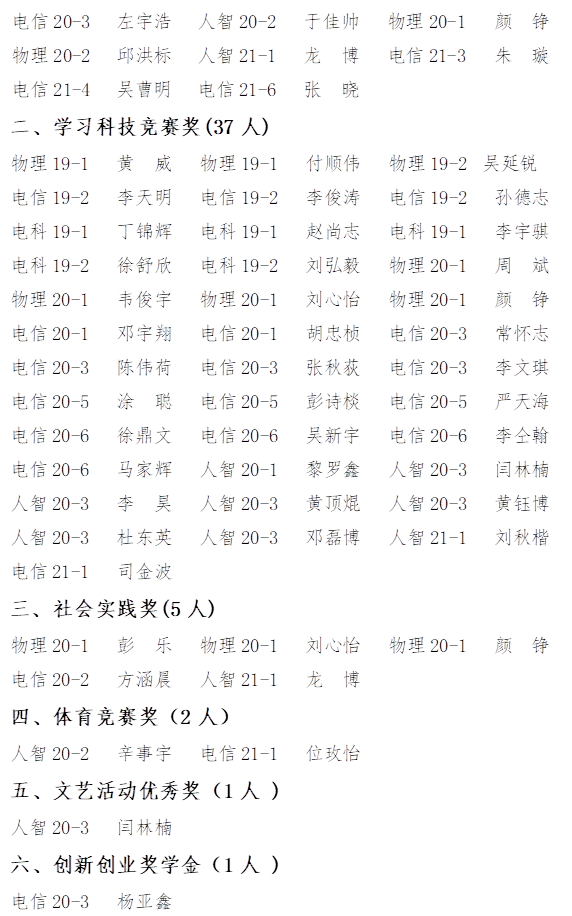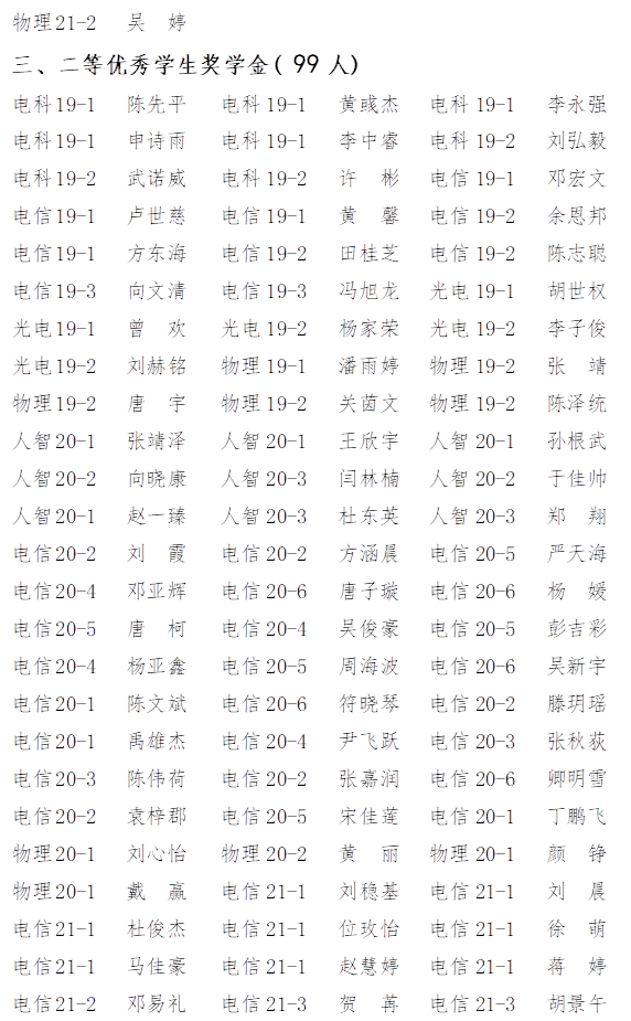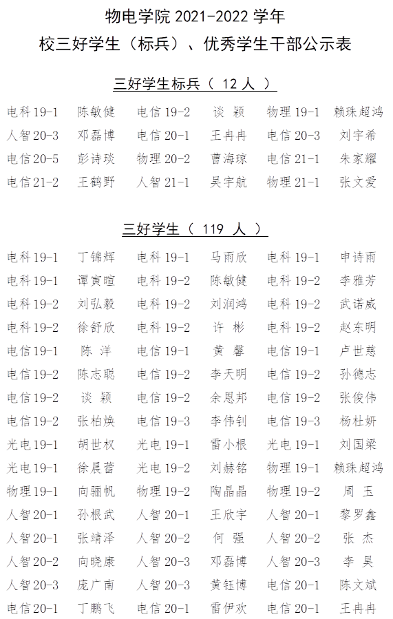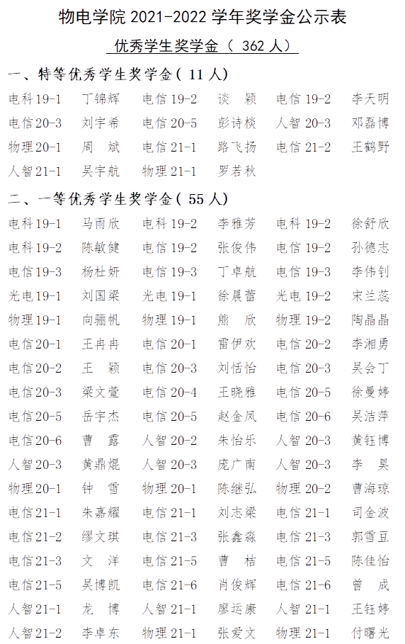 根据《伟德betvlctor1946源于英国综合测评及评奖评优管理办法》的要求,经个人申请,班级推荐、物理与电子科学学院2021-2022学年奖学金与三好学生、三好学生标兵、优秀学生干部经评审委员会认真评审,现将名单公示如下: