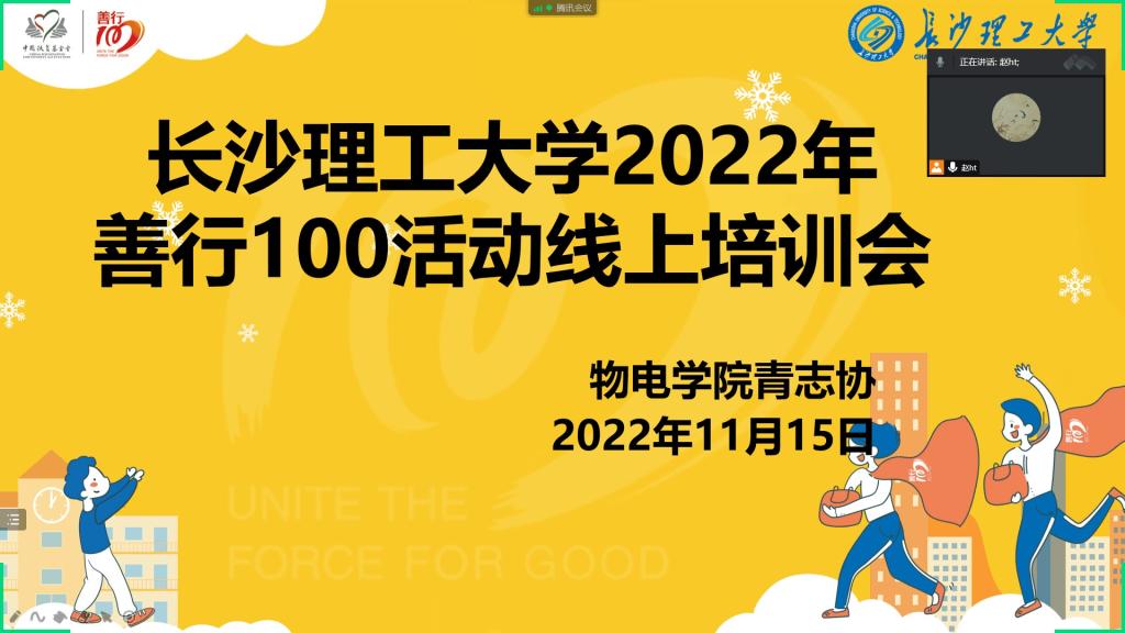 2022年11月15日下午14时许,物理与电子科学学院“善行一百·温暖行动”活动培训会议在线上成功开展。本次会议由青志协副会长赵慧婷主持,全体志愿者参加。