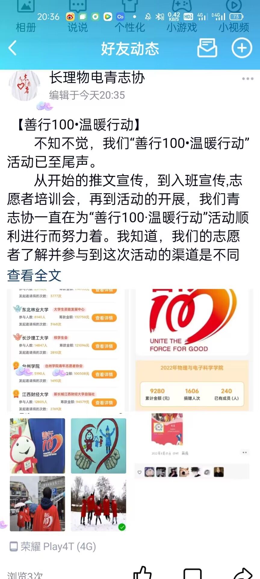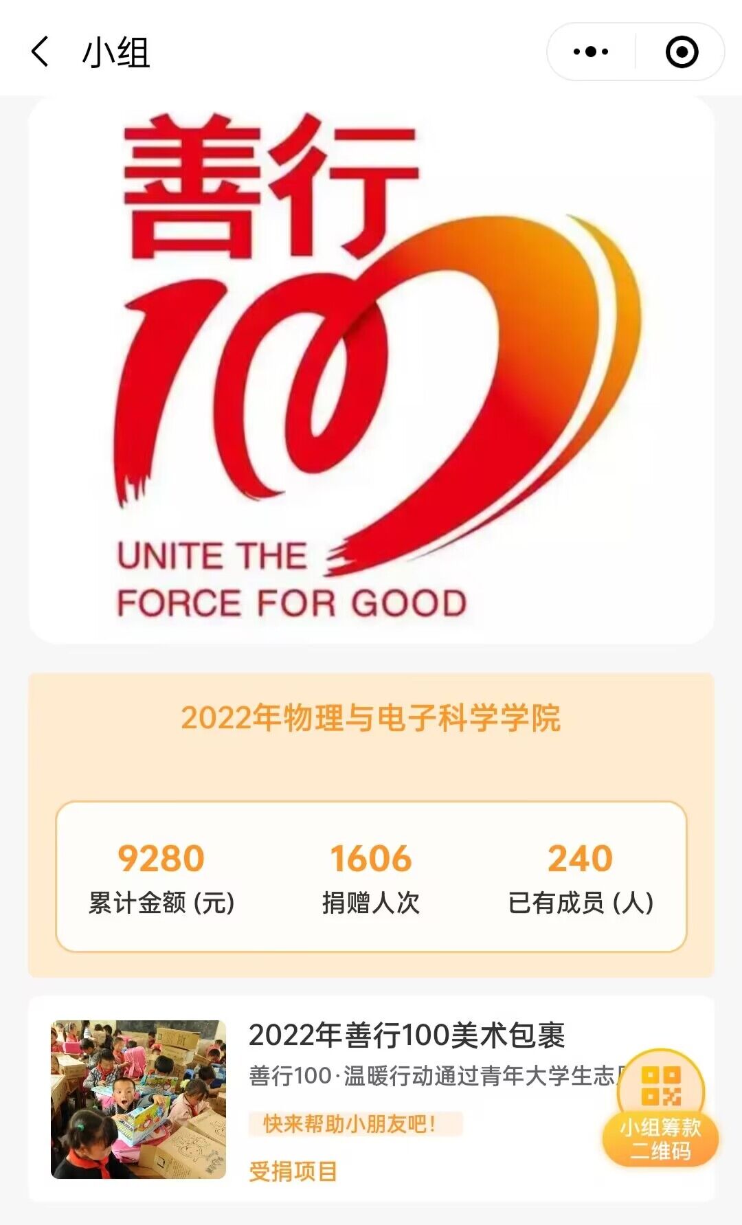 该活动旨在丰富乡村小学生美术生活,启迪欠发达地区孩子美术梦想,鼓励长理学子积极投身于志愿活动中,提升大学生综合素质,营造全民公益的良好氛围。自11月6日开展以来,在院领导和学生会青志协的组织下,物电学子积极响应学校号召,充分利用微信和QQ等各类媒体平台,开展善行一百线上劝募活动,同心携手,共筑善心,展现了物电学子良好的精神风貌。